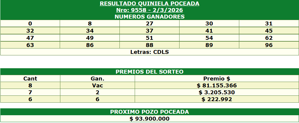 RESULTADO QUINIELA POCEADA Nro: 9558 – 02 Marzo 2026