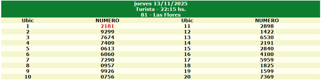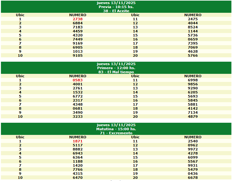 En cada sorteo se otorgan premios a los 20 números que resultan ganadores. El primer premio corresponde al primer número extraído y es el que mayor pago ofrece, usualmente 70 veces el monto apostado si aciertas de forma exacta, según la modalidad y agencia donde realices la jugada.