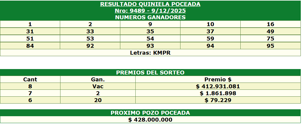 RESULTADO QUINIELA POCEADA Nro: 9488 – 9 Diciembre 2025
